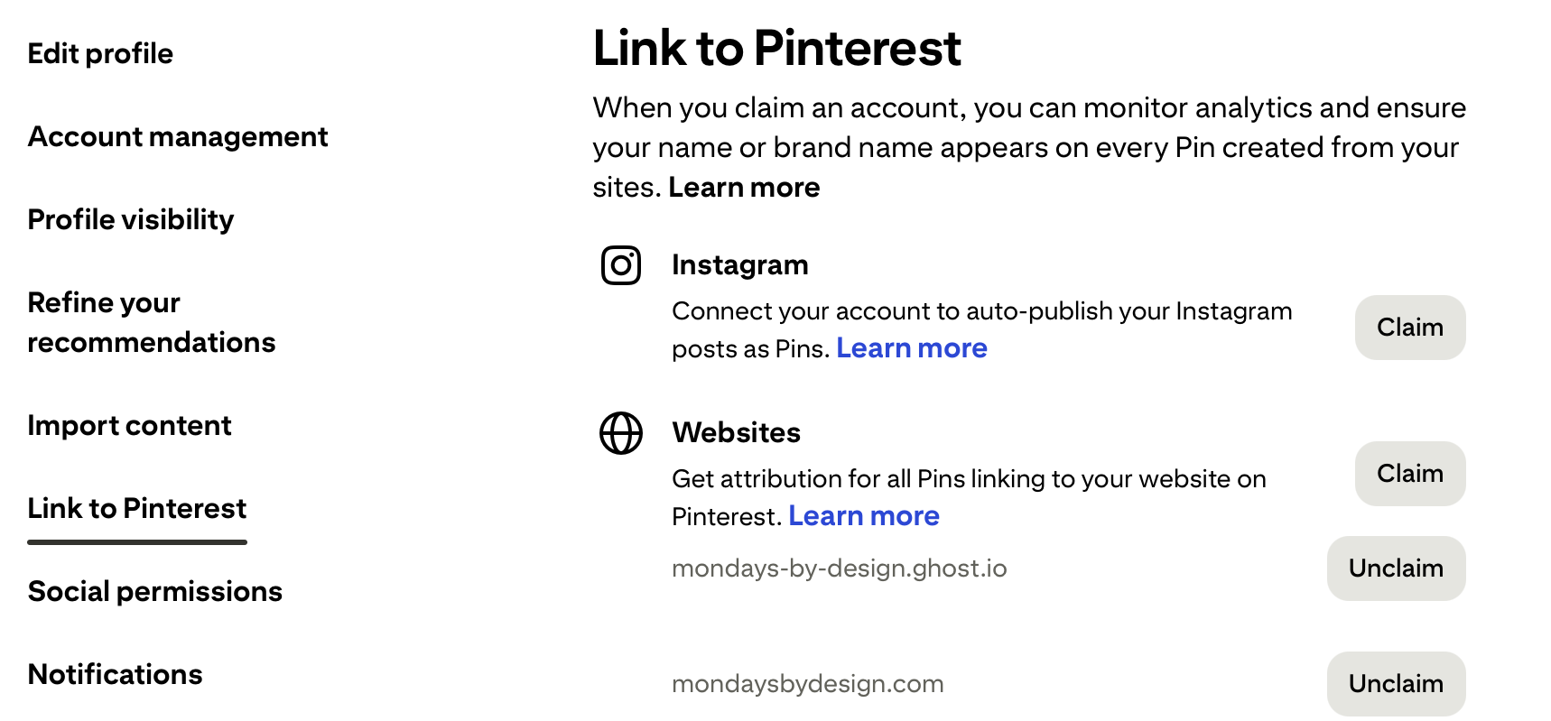 Claiming your site ensures that when your blog posts, opt-ins, or resources are pinned, Pinterest knows they belong to your business.